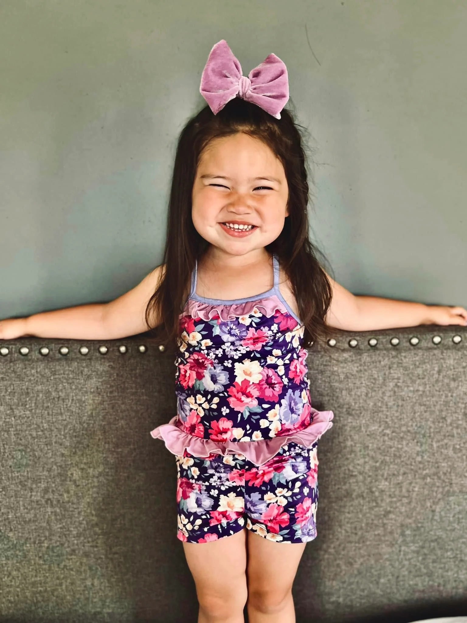 Indulge in the ultimate luxury with our Purple Summer Flowers Tank Top Lounge Set. Featuring delicate criss cross back straps and a soft lightweight fabric, this set will keep your little one cool and comfortable. The ruffle hem adds a feminine touch we just adore!