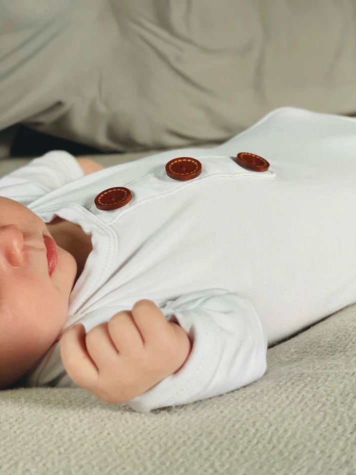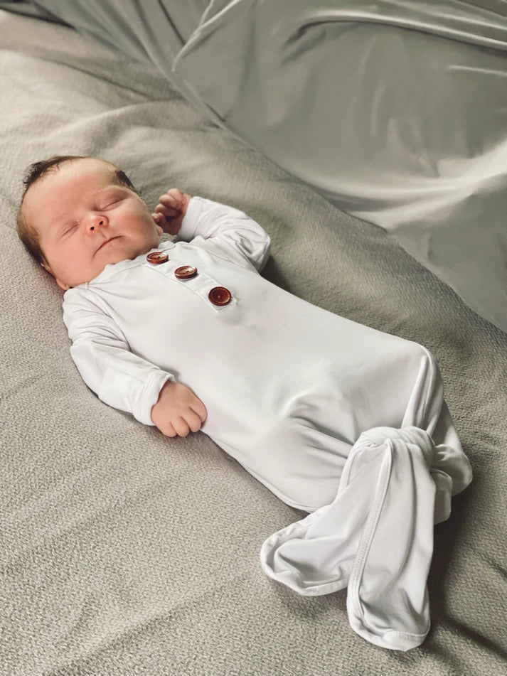 Crafted from the highest quality Bamboo, our gowns are soft and gentle against your baby's delicate skin. From the fold over mittens to protect from scratches to the adjustable knot tie bottom (can you say easy late night diaper changes?!) we included the best features to make your life just a little bit easier. Available in a variety of dreamy colors- a must have for your hospital bag, first photos and newborn snuggles.